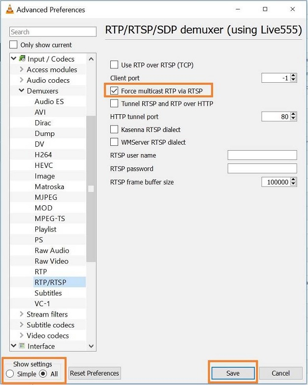 In order to receive and decode a Multicast stream coming from an ION encoder there are 2 possibilities. The first one is the Active mode, where the video stream decoder will establish a connection directly to a video stream source (in our case it’s the ION encoder) and request the required video stream. In the popular software decoder VLC, this can be achieved by forcing Multicast RTP via RTSP from the Advanced Preferences.