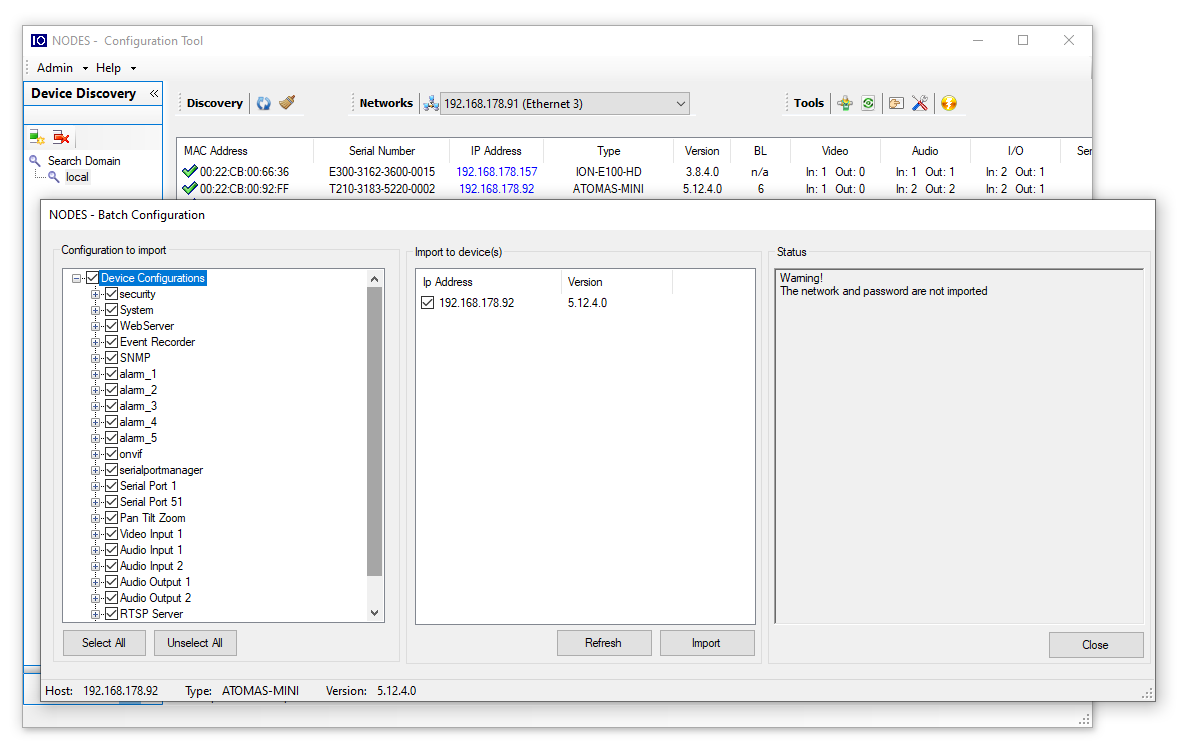 For importing a previously saved configuration, simply select in the list of devices all of the target units (this can be one single unit or multiple units of the same product), then right-click and choose “Import Configuration”. A batch configuration window will appear, allowing you to fine-tune the exact configuration sections that should be imported, as well as the list of devices to import to. Hitting the “Import” button will begin the process and a confirmation that the operation was successful will be displayed in the Status panel.