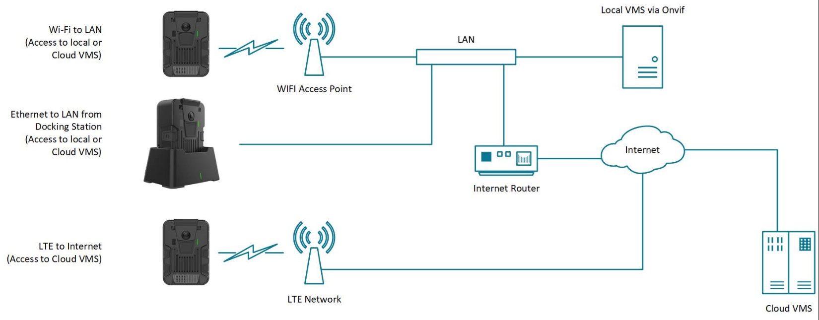 Most body cameras solutions in the market today are designed for law enforcement applications only, and are usually limited to operating in closed systems. The audio-video evidence is usually recorded by the camera to its internal memory. When the body camera wearer returns to a centralized hub at the end of their shift, video and data is typically uploaded through a docking station to a closed system video management server. In most cases, there is no real time tracking or live streaming capabilities and there isn’t a simple way to integrate the body camera into a wider solution using standard API’s or protocols.